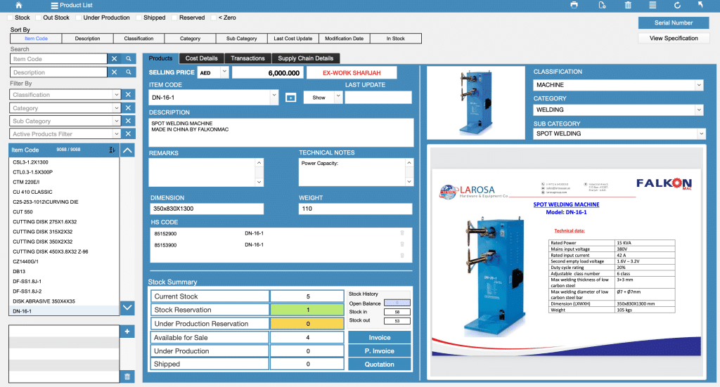 Product and technical data The system maintains a complete and searchable catalog of more than 1,600 machines and over 8,000 spare parts, each documented with specifications, costs, manuals, photos, PDFs, and real-time stock status.
